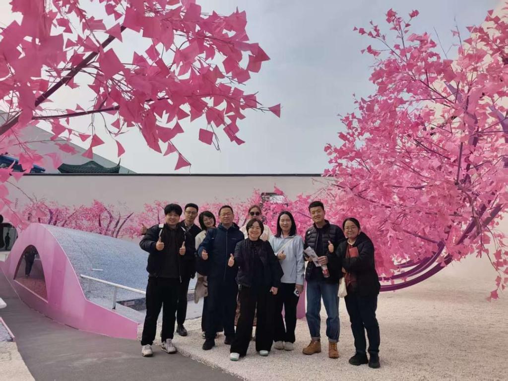 Departing from campus at 9:30 AM amid laughter and cheer, the group arrived at the Langfang's A Dream of the Red Mansions · Drama Fantasy City at 10:40 AM. Upon entry, artistic installations immediately captivated attendees, who gathered for a group photo at the entrance to capture the season's beauty.