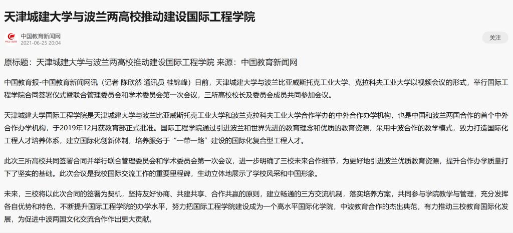 6月25日,中国教育新闻网对BG大游官方网站与波兰两所高校共同签署合同并举行联合管理委员会和学术委员会第一次会议进行如下报道: