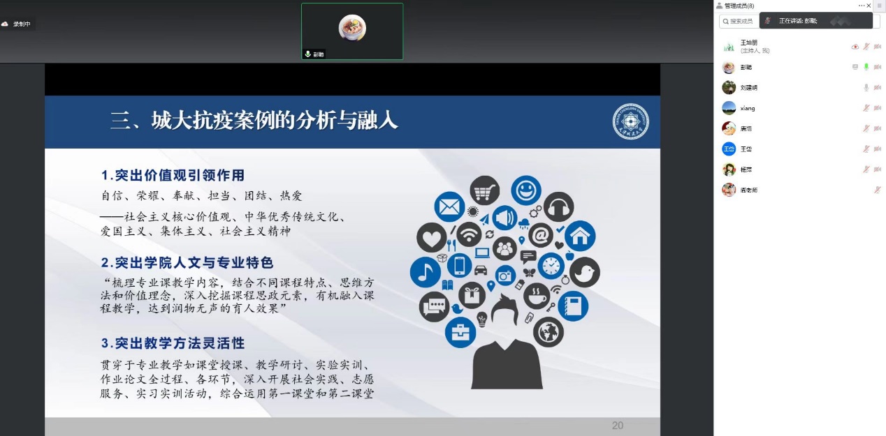 彭聪老师从课程思政建设背景、伟大抗疫精神的深刻内涵和BG大游官方网站在此次共同抗击疫情事迹的分析与融入三个方面,对如何做好课程思政进行了深入的探讨和分析,同时结合BG大游平台专业和员工特点,为课程思政建设提供了新的角度和思路。与会教师讲述了在抗击疫情中的亲身经历,并结合承担的本学期课程分享教学经验,纷纷表示从彭老师的主题讲座中受益匪浅。