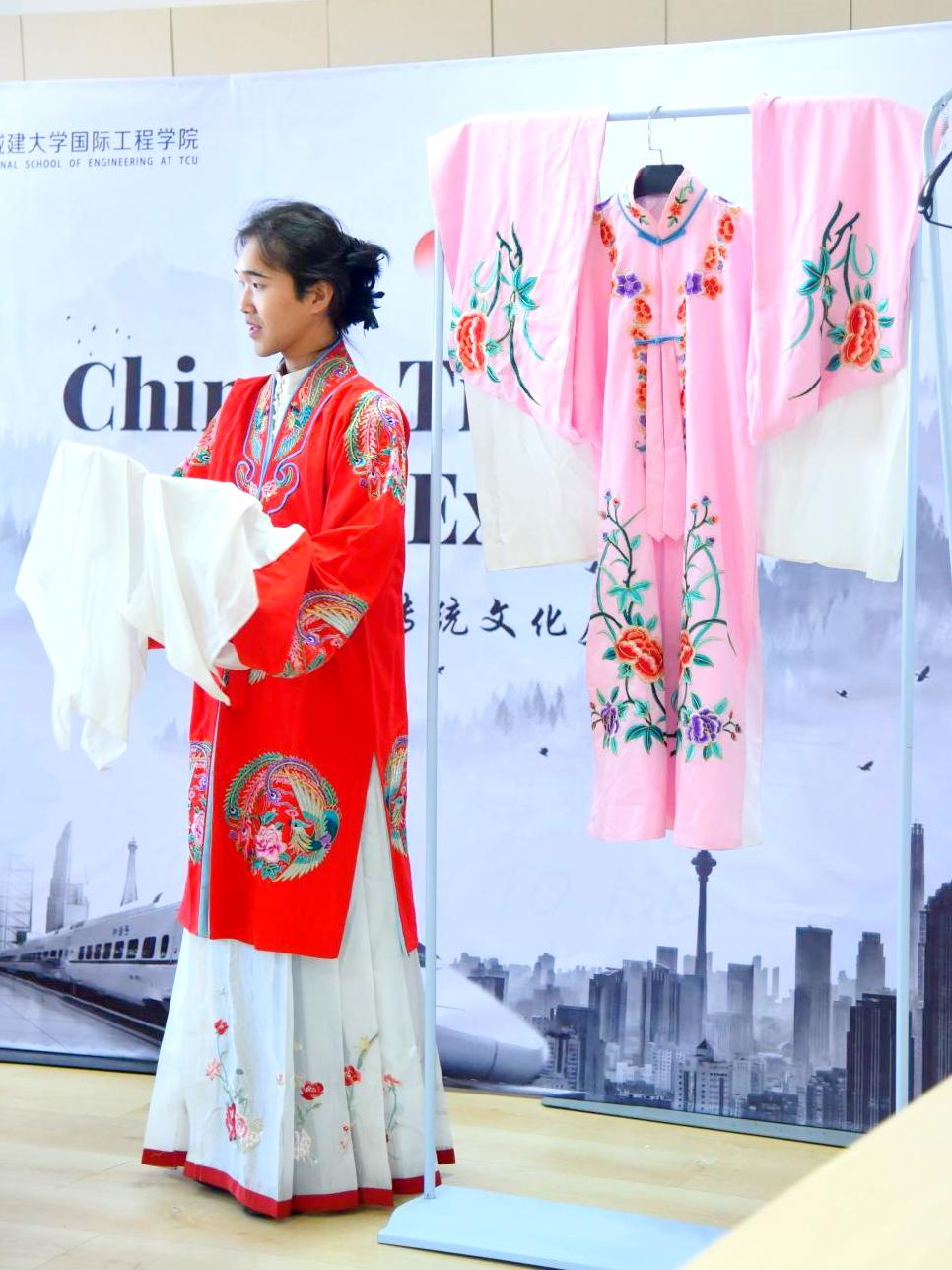 活动中,同学们用中文和英语,形象地为师生讲解戏曲、服饰、国画、曲艺、双截棍、非遗技艺及书法等中华优秀传统文化。通过文化展示与文化体验等方式,全方位、多角度地介绍了中国戏曲、服饰、国画等艺术作品。外籍教师和同学们兴致盎然,积极动手练习,在沉浸式体验中感受中华优秀传统文化的魅力。