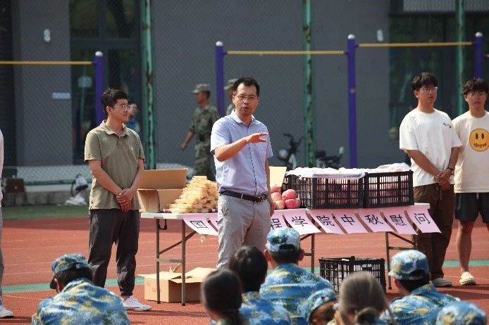 9月17日,恰逢中秋佳节,BG大游平台党总支副书记孔伟、新生辅导员田雨及2024级新生助班携水果、月饼等物资一同来到军训场地,看望并慰问正在参加军训的同学和教官。