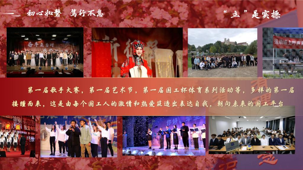 第一届歌手大赛,艺术节,国工杯竞赛等多达数十项的活动,是由激情和热爱筑造出表达自我,朝向未来的青春平台。 唱出青春之风貌, 用真情流露热爱书籍的热情, 用汗水与激情写出属于国工青年的热血篇章。用镜头记录多彩绚烂的瞬间,视频号的原创视频,每一幕都是热爱与担当汇聚的精彩故事。
