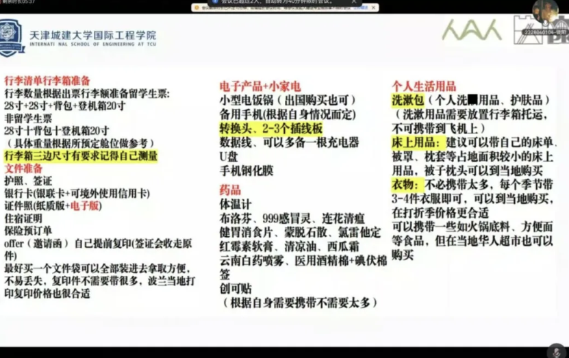 On March 8, 2025, International School of Engineering organized an online pre-departure experience-sharing session for the 2023 undergraduates preparing to study in Poland. The session was hosted by counselor Cui Afeng, with all 2023 undergraduates attending virtually.