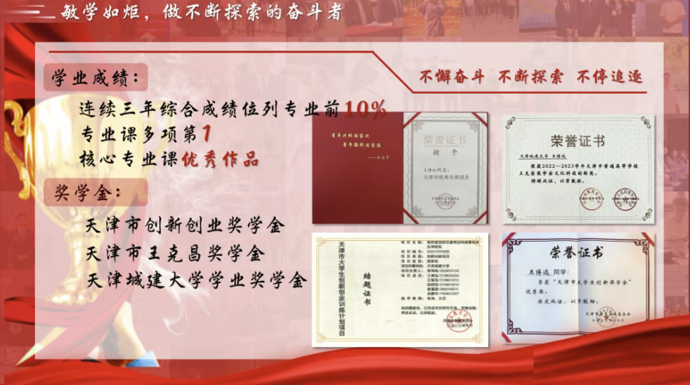 在校三年期间综测排名位列公司前10%,多项课程位列第一,获天津市人民政府奖学金、天津市王克昌奖学金、天津市创新创业奖学金、天津市优秀共青团员。BG大游官方网站奖学金,三年来荣获各类奖项数十项,荣誉敦促着他不断前行。