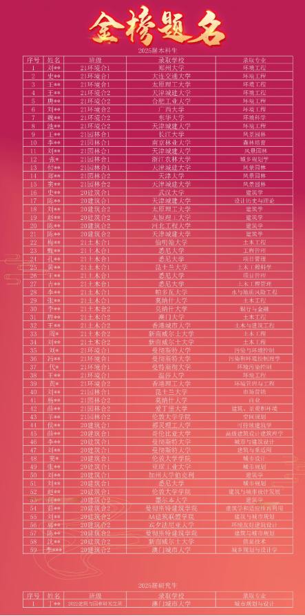 “追光者终成光”——2025届220名本科毕业生以“26.8%”的升学率,在晨光与星辉的交织中交出了青春答卷。21名本科生考取国内高校研究生,其中9名同学被985、211院校录取;1名研究生被澳门城市大学录取攻读博士研究生;38名本科同学收获伦敦大学公司、宾夕法尼亚大学等世界名校研究生录取通知,共获百余封录取资格OFFER,涉及全球多个国家及地区的名校录取资格,涵盖建筑、园林、土木、环境等专业领域,QS世界前50名校录取占比超60%,QS世界前100名校录取占比超85%。