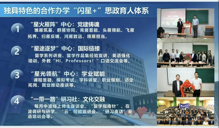 The college has established a distinctive "Spark Star+" ideological and political education framework within its cooperative education model: "Spark Vanguard " Party Construction Center strengthens ideological foundations through eight progressive programs, such as Foundational Training, Collaborative Growth, Energy Reserves, Leadership Development, Responsibility Cultivation and etc. "Stellar Path to Dreams" Study-Abroad Guidance Center has organized a series of study-abroad lectures, portfolio workshops, intensive English training, and events like the "Hi, Professors!" oral English sessions. "Starlight Pilot" Student Advising Center empowers academic success through course tutoring, mock exams, disciplinary seminars, career planning, industry partnerships, and employment forums. The "Belt and Road” Study Club promotes cultural exchange through monthly online China-Poland faculty-student dialogues, "Study Abroad Compass" sessions, Poland-based research projects, virtual experience-sharing events, and "Night Study" English workshops.