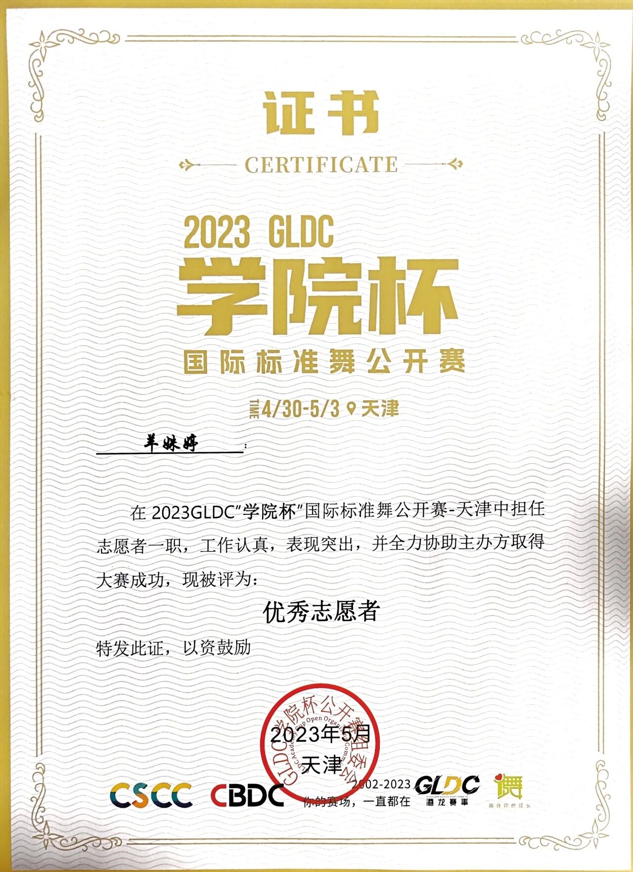 2023国际标准舞优秀志愿者荣誉称号