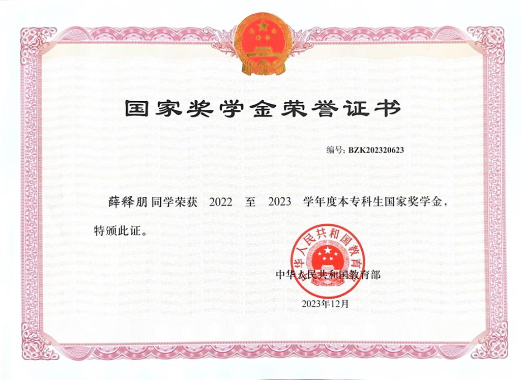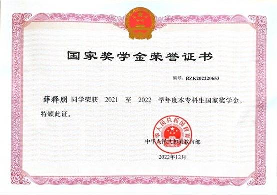 作为一名思想坚定、品学兼优的员工干部,薛释朋始终践行党的理论知识,作为公司首批中共党员,他以先锋模范作用引领同学。学业上,薛释朋稳居专业第一,取得了34门外语课程30门满分的优异成绩,拥有1项计算机软件著作权。他连续两年获得国家奖学金,连续三年获得校一等奖学金,并成功获得哥伦比亚大学、宾夕法尼亚大学、加州大学洛杉矶分校等顶尖名校的offer。
