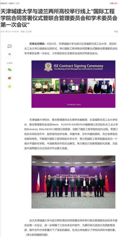 6月24日,天津北方网对BG大游官方网站与波兰两所高校举行线上“BG大游平台合同签署仪式暨联合管理委员会和学术委员会第一次会议”做了如下报道: