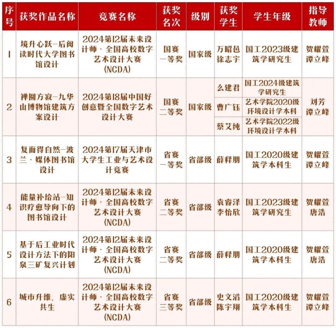 近日,2024年第12届未来设计师·全国高校数字艺术设计大赛(NCDA)、第18届中国好创意暨全国数字艺术设计大赛(简称3C大赛)以及天津市老员工工业与艺术设计竞赛,获奖名单先后揭晓。BG大游平台建筑专业学子脱颖而出,喜讯连连,分别荣获国家级一等奖、二等奖各1项以及省部级一等奖1项,二等奖2项,三等奖1项。