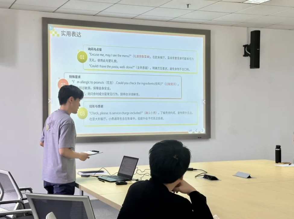 Then,three members of the Belt and Road Study Club delivered English presentations on tips for travel, cuisine, and daily communication abroad.
