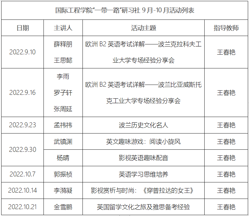 此次研习社英语学习活动为提升新生学习兴趣、做好英语学习规划、积极备考欧洲B2英语考试起到了良好的引领作用。以下是研习社9月-10月英语学习活动列表,欢迎同学们踊跃参加。